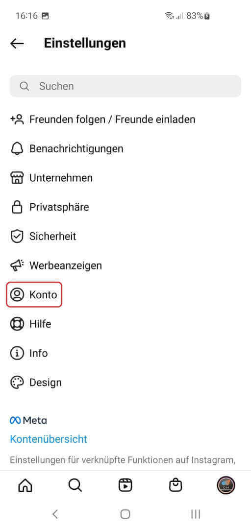 Im Menü "Einstellungen" klickst du jetzt auf das Untermenü "Konto"
